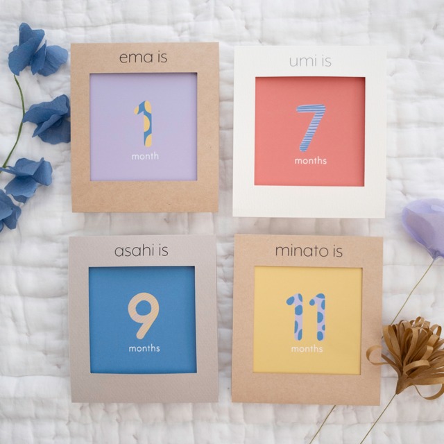 baby monthly card/frame iroiro2 color:E [square] 【商品内容】 ・マンスリーカード 数字 12枚 (1month〜12months) サイズ:約100mm×114mm ・ネームフレーム 1枚 サイズ:約102mm×115mm カラーは[クラフト][グレー][オフホワイト]の3色 【商品説明】 お名前入りのフレームに、カラフルなマンスリーカードを組み合わせた、毎月の記念撮影にぴったりなセットです。 月齢ごとにカードを入れ替えるだけで、同じフレームで成長の記録を残すことができます。 お子様のお名前が入ることで、世界にひとつだけの特別なアイテムに。 ご自宅用はもちろん、出産祝いのプレゼントにもおすすめです。 記念日カード(オプション)を追加すれば、ニューボーンフォトや100日祝い、ハーフバースデー、1歳誕生日にも活用できます。 形違いや色違いでの追加注文(オプション)も可能なので、双子ちゃんにもぴったりです。 ケーキと一緒に立てて撮影したり、ペーパーフラワーを飾って華やかにするのもおすすめです。 *基本セットは数字12枚・ネームフレームのみです。 記念日カード・フォトフレーム(ウッド)・ペーパーフラワーはオプション商品です。 *ご購入の際に、カートに進み[備考欄]に以下の項目をご記入ください* ネームフレームのお名前/アルファベット・小文字(例:iroha) ◯ネームフレームの形は[アーチ][ふきだし][ホーム][スクエア]の4種類、 カラーは[クラフト][グレー][オフホワイト]の3色です。 ◯マンスリーカード(1〜12の数字のカード)は、[カラーC][カラーD][カラーE]の3色。 背景が色付きの【いろいろ1】・背景が白の【いろいろ2】の2パターンございます。 ・・・・・・・・・・・・・・・・・・・・・・・・・ ・・以下の商品はオプションにて、ご選択ください・・ ●記念日カード 4枚(just born / 100 days / half birthday / first birthday) 500円 ●フォトフレーム (ウッド)1個(198×147mm・スタンド可・ポストカード・2L対応・素材:MDF ポリスチレン) 500円 木目調のおしゃれなフレームです。 クリアな背面はガラスではなくポリスチレン素材のため、お子さまのそばでも安心してご使用いただけます。 ●ペーパーフラワー(12本) 2000円 ご希望のカラーをお選びください ↓色のご確認は以下URLの商品ページでお願いいたします↓ https://shop.marbledeco.jp/categories/6400314 *オプション/フォトフレームとペーパーフラワー2点とも追加した場合は、クリックポストで2便に分けてのお届けになります。 ●マンスリーカード・1セット追加 900円 1セット(数字12枚/ネームフレーム1枚/記念日カード4枚) 形違い・色違いで注文可能です。双子ちゃんにもおすすめです。 フレームマンスリーカードでございましたら、すべての商品からお選びいただけます。 ↓[1セット追加]をご注文ご希望の方は、以下URLのオプションをカートに追加お願いします↓ https://shop.marbledeco.jp/items/116302993 ====== ◎レビュー投稿のお約束◎ ====== === 記念日カード・無料キャンペーン実施中 === 「レビュー投稿のお約束」をして頂けるお客様には、記念日カード 4枚(通常500円)を無料でプレゼント!! ・ご購入の際に、オプション[記念日カード 4枚*レビュー投稿のお約束で無料キャンペーン応募*]を選択し、 カートに進んでください。 *1ヶ月以内に写真提供・レビュー投稿がない場合は、通常料金(手数料込)をご請求させていただきます。 ========================= ★商品発送後の変更はできかねますので、ご記入間違いにご注意ください★ ↓記念日フォトにおすすめのクレイケーキやケーキトッパーも販売しています↓ https://shop.marbledeco.jp/items/all 赤ちゃんのぬいぐるみの身長(頭からおくるみの下まで):33cm ***注意事項*** *お届け場所が北海道・沖縄・離島の方* 配送料は無料です。 ご希望の日にちに配送が可能か確認いたしますので、ご注文前に一度お問い合わせよりご連絡ください。 *パソコンモニターの発色や写真の撮影状況により、実際の商品と多少色味が異なる場合がございます。 *ハンドメイドの商品のため、多少の傷や汚れ・シワ・凹凸などがみられる場合がございます。 *商品は1点ずつ個体差があります。商品画像とは異なる場合がございますことをご了承ください。 *サイズは5mm-1cm程前後する場合がございます。 *ご不明な点がございましたら、お気軽にご連絡ください。 MA0048-04