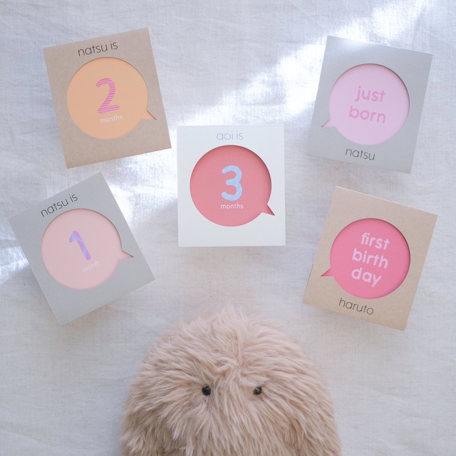 baby monthly card/frame iroiro1 color:E[speech bubble] 【商品内容】 ・マンスリーカード 数字 12枚 (1month〜12months) サイズ:約100mm×114mm ・ネームフレーム 1枚 サイズ:約102mm×115mm カラーは[クラフト][グレー][オフホワイト]の3色 【商品説明】 お名前入りのフレームに、カラフルなマンスリーカードを組み合わせた、毎月の記念撮影にぴったりなセットです。 月齢ごとにカードを入れ替えるだけで、同じフレームで成長の記録を残すことができます。 お子様のお名前が入ることで、世界にひとつだけの特別なアイテムに。 ご自宅用はもちろん、出産祝いのプレゼントにもおすすめです。 記念日カード(オプション)を追加すれば、ニューボーンフォトや100日祝い、ハーフバースデー、1歳誕生日にも活用できます。 形違いや色違いでの追加注文(オプション)も可能なので、双子ちゃんにもぴったりです。 ケーキと一緒に立てて撮影したり、ペーパーフラワーを飾って華やかにするのもおすすめです。 *基本セットは数字12枚・ネームフレームのみです。 記念日カード・フォトフレーム(ウッド)・ペーパーフラワーはオプション商品です。 *ご購入の際に、カートに進み[備考欄]に以下の項目をご記入ください* ネームフレームのお名前/アルファベット・小文字(例:iroha) ◯ネームフレームの形は[アーチ][ふきだし][ホーム][スクエア]の4種類、 カラーは[クラフト][グレー][オフホワイト]の3色です。 ◯マンスリーカード(1〜12の数字のカード)は、[カラーC][カラーD][カラーE]の3色。 背景が色付きの【いろいろ1】・背景が白の【いろいろ2】の2パターンございます。 ・・・・・・・・・・・・・・・・・・・・・・・・・ ・・以下の商品はオプションにて、ご選択ください・・ ●記念日カード 4枚(just born / 100 days / half birthday / first birthday) 500円 ●フォトフレーム (ウッド)1個(198×147mm・スタンド可・ポストカード・2L対応・素材:MDF ポリスチレン) 500円 木目調のおしゃれなフレームです。 クリアな背面はガラスではなくポリスチレン素材のため、お子さまのそばでも安心してご使用いただけます。 ●ペーパーフラワー(12本) 2000円 ご希望のカラーをお選びください ↓色のご確認は以下URLの商品ページでお願いいたします↓ https://shop.marbledeco.jp/categories/6400314 *オプション/フォトフレームとペーパーフラワー2点とも追加した場合は、クリックポストで2便に分けてのお届けになります。 ●マンスリーカード・1セット追加 900円 1セット(数字12枚/ネームフレーム1枚/記念日カード4枚) 形違い・色違いで注文可能です。双子ちゃんにもおすすめです。 フレームマンスリーカードでございましたら、すべての商品からお選びいただけます。 ↓[1セット追加]をご注文ご希望の方は、以下URLのオプションをカートに追加お願いします↓ https://shop.marbledeco.jp/items/116302993 ====== ◎レビュー投稿のお約束◎ ====== === 記念日カード・無料キャンペーン実施中 === 「レビュー投稿のお約束」をして頂けるお客様には、記念日カード 4枚(通常500円)を無料でプレゼント!! ・ご購入の際に、オプション[記念日カード 4枚*レビュー投稿のお約束で無料キャンペーン応募*]を選択し、 カートに進んでください。 *1ヶ月以内に写真提供・レビュー投稿がない場合は、通常料金(手数料込)をご請求させていただきます。 ========================= ★商品発送後の変更はできかねますので、ご記入間違いにご注意ください★ ↓記念日フォトにおすすめのクレイケーキやケーキトッパーも販売しています↓ https://shop.marbledeco.jp/items/all 赤ちゃんのぬいぐるみの身長(頭からおくるみの下まで):33cm ***注意事項*** *お届け場所が北海道・沖縄・離島の方* 配送料は無料です。 ご希望の日にちに配送が可能か確認いたしますので、ご注文前に一度お問い合わせよりご連絡ください。 *パソコンモニターの発色や写真の撮影状況により、実際の商品と多少色味が異なる場合がございます。 *ハンドメイドの商品のため、多少の傷や汚れ・シワ・凹凸などがみられる場合がございます。 *商品は1点ずつ個体差があります。商品画像とは異なる場合がございますことをご了承ください。 *サイズは5mm-1cm程前後する場合がございます。 *ご不明な点がございましたら、お気軽にご連絡ください。 MA0048-02
