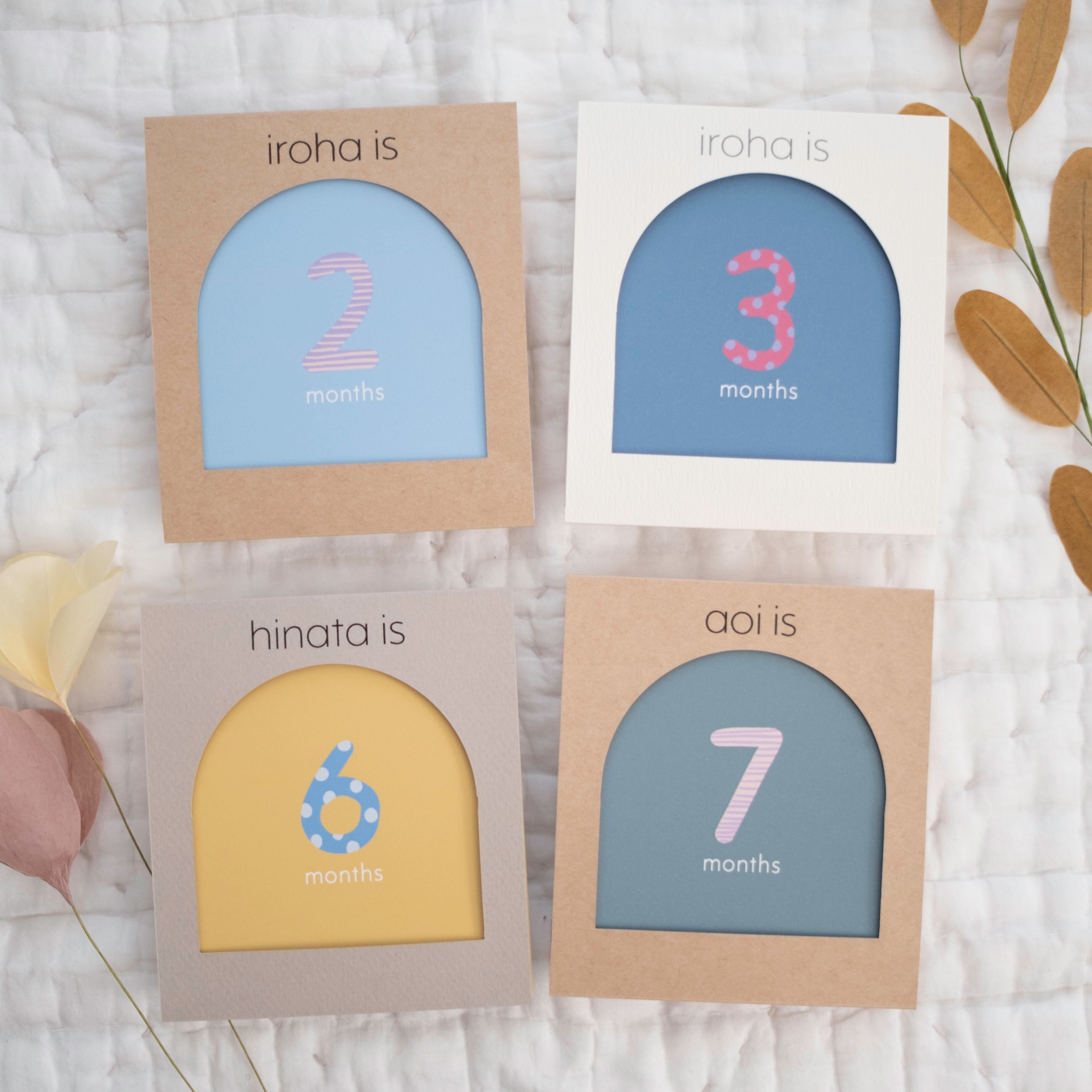 お名前入りのフレームに、カラフルなマンスリーカードを組み合わせた、毎月の記念撮影にぴったりなセットです。