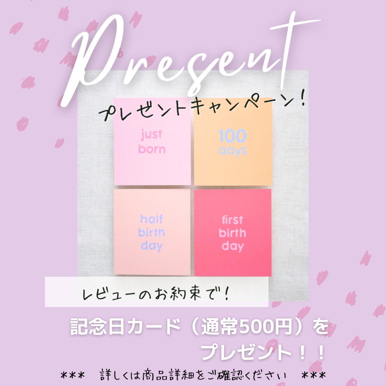 ・ご購入の際に、オプション[記念日カード 4枚*レビュー投稿のお約束で無料キャンペーン応募*]を選択し、