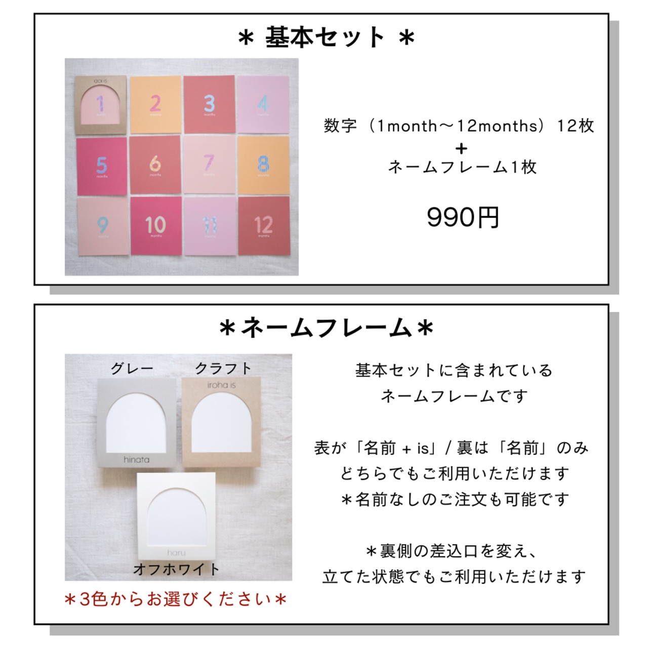 お名前入りのフレームに、カラフルなマンスリーカードを組み合わせた、毎月の記念撮影にぴったりなセットです。