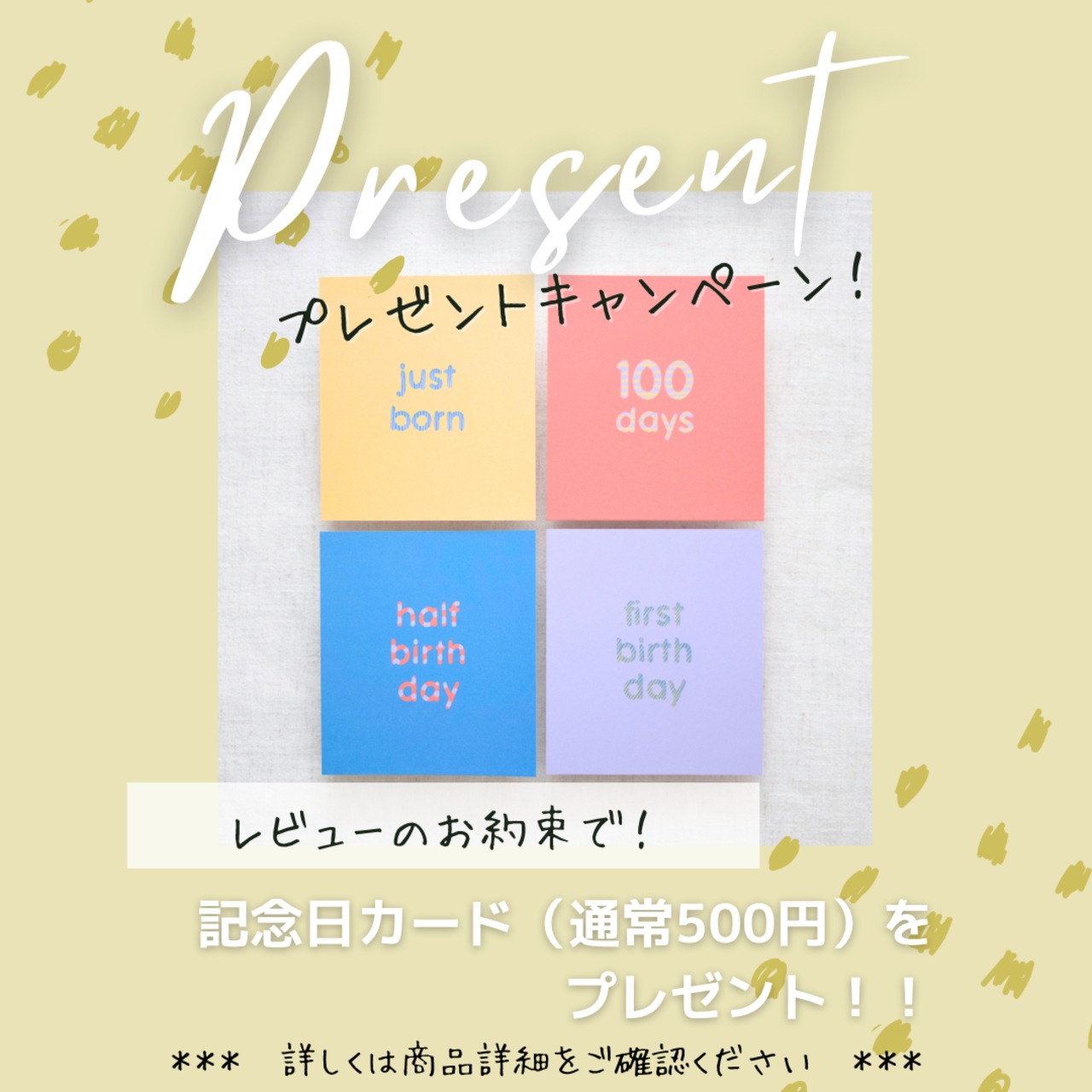 ・ご購入の際に、オプション[記念日カード 4枚*レビュー投稿のお約束で無料キャンペーン応募*]を選択し、