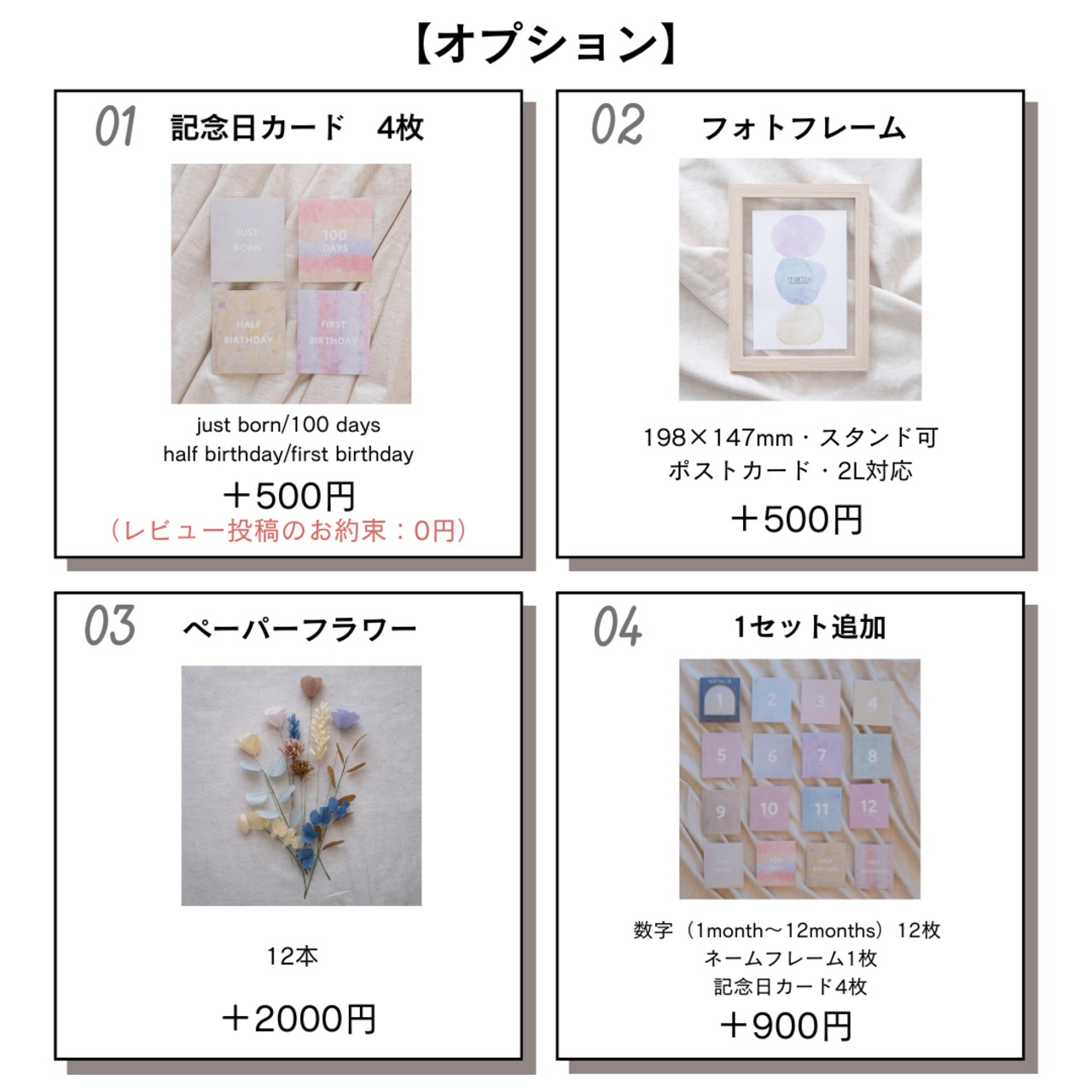 オプションで記念日カードを追加すると、毎月の月齢フォトの撮影以外にも、ニューボーンフォト・100日祝い(お食い初め)・ハーフバースデー・1歳誕生日の記念日フォトの撮影にも使えます。